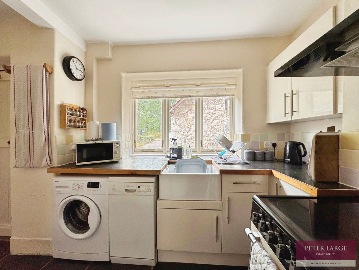 Having an array of units comprising wall cupboards, slate worktop surfaces with drawer and base cupboards beneath, 'Cook master' range cooker with five ring electric hob over and extractor hood above, slate tiled flooring, Belfast sink with mixer tap over, space and plumbing for automatic washing machine and dishwasher, space for tall standing fridge/freezer, part tiled walls, radiator, top box housing the electric meter and consumer unit, original single glazed window overlooking the front.