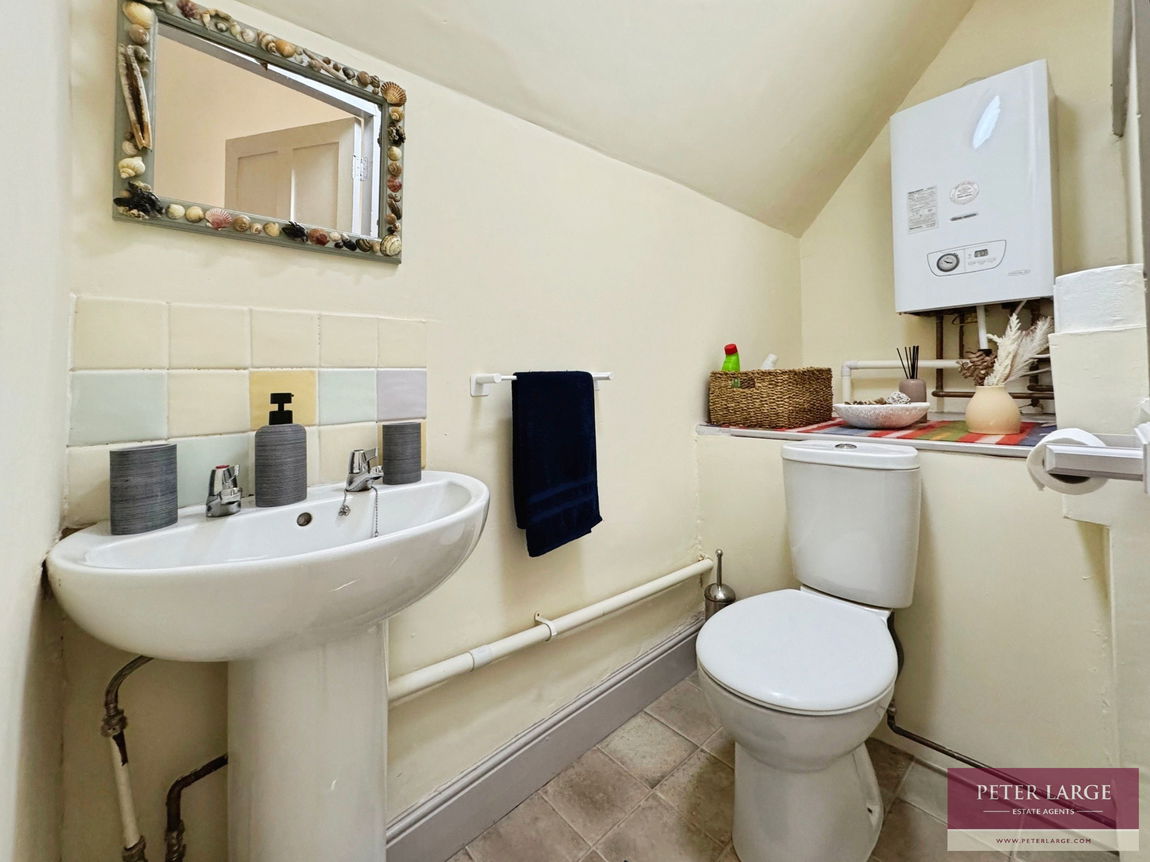With pedestal wash hand basin with tiled splashback, low flush W.C, tiled floor, wall mounted 'Glow Worm' combination boiler supplying the domestic hot water and radiators and extractor fan.