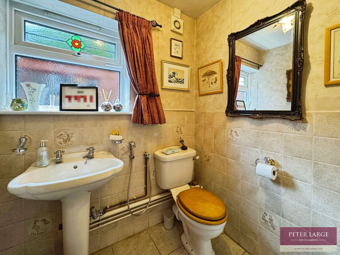 Having low flush W.C, pedestal wash hand basin, extractor fan, tiled floor, part tiled walls, radiator and uPVC double glazed frosted window.