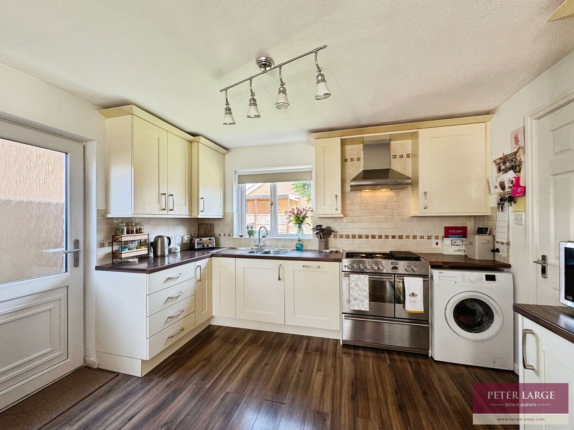 Having a comprehensive range of Cream fitted units to include, wall cupboards, worktop surfaces with drawer and base cupboards beneath, integrated dishwasher, integrated freezer, space and plumbing for automatic washing machine and dryer, 'Stoves' range cooker with extractor hood over, double drainer stainless steel sink with mixer tap over, laminate floor, wall cupboard housing the 'Glow Worm' boiler supplying the domestic hot water and radiators, uPVC double glazed window overlooking the front and uPVC double glazed frosted door giving access to the side.  Dining area has radiator, space for tall standing fridge/freezer and large double glazed sliding patio doors into: