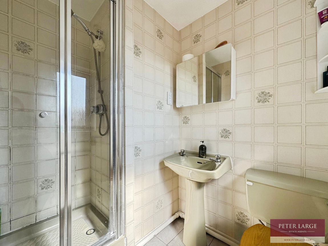 Having a three piece suite comprising low flush W.C, pedestal wash hand basin, bath with mains shower over and privacy screen, fully tiled walls, tiled floor, shaver point, radiator and uPVC double glazed frosted window over the front.