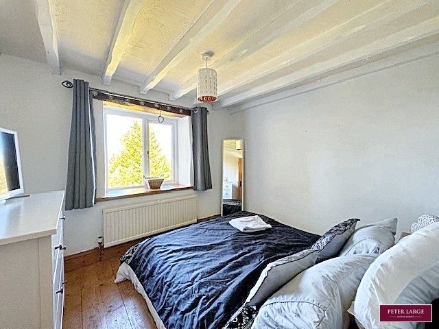 With a range of fitted wardrobes and open shelving, dual aspect double glazed windows with deep sills, painted ceiling timbers, continuation of the timber floor and two double panelled radiators,
