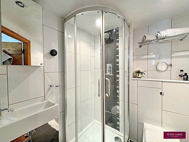 Having a shower cubicle, wash hand basin set into vanity unit, low flush w.c., fully tiled walls and tiled floor.
