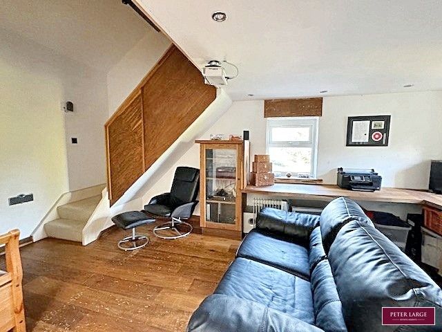 The property is approached over a gravelled courtyard with parking.  There is a right of way along the adjoining lane to the rear of the property giving vehicular access to the good size enclosed rear garden which is mainly laid to lawn with a gravelled parking bay, partial timber fencing and established hedging providing privacy with mature trees, the paved patio is ideal for entertaining along with the raised timber decked seating area bounded by part stone walling.  There is an OUTBUILDING divided into two rooms ideally used as a STUDY with three double glazed windows, power points, inset spotlighting to part, vaulted ceiling to one area, a stairs leads to a mezzanine storage area.