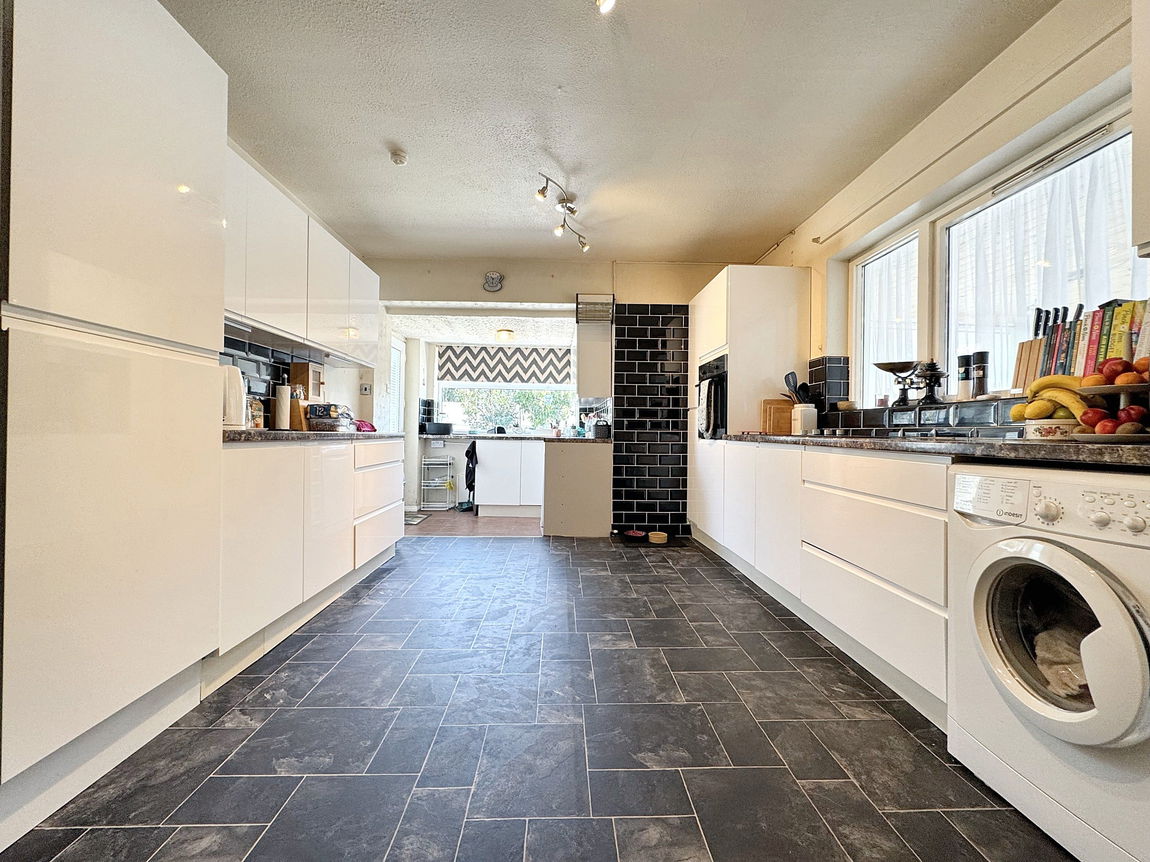 Plenty of space within this large kitchen which is fitted with a range of wall and base cabinets with worktop surfaces over. One and a half bowl ceramic sink and drainer with mixer tap, space for dishwasher, electric oven within tower unit, electric four ring hob, space for fridge freezer, space and plumbing for washing machine. Part tiled walls, radiator, vinyl flooring, power points, two windows and door to rear. Open archway into further dining area with radiator, power points and continuation of vinyl flooring.