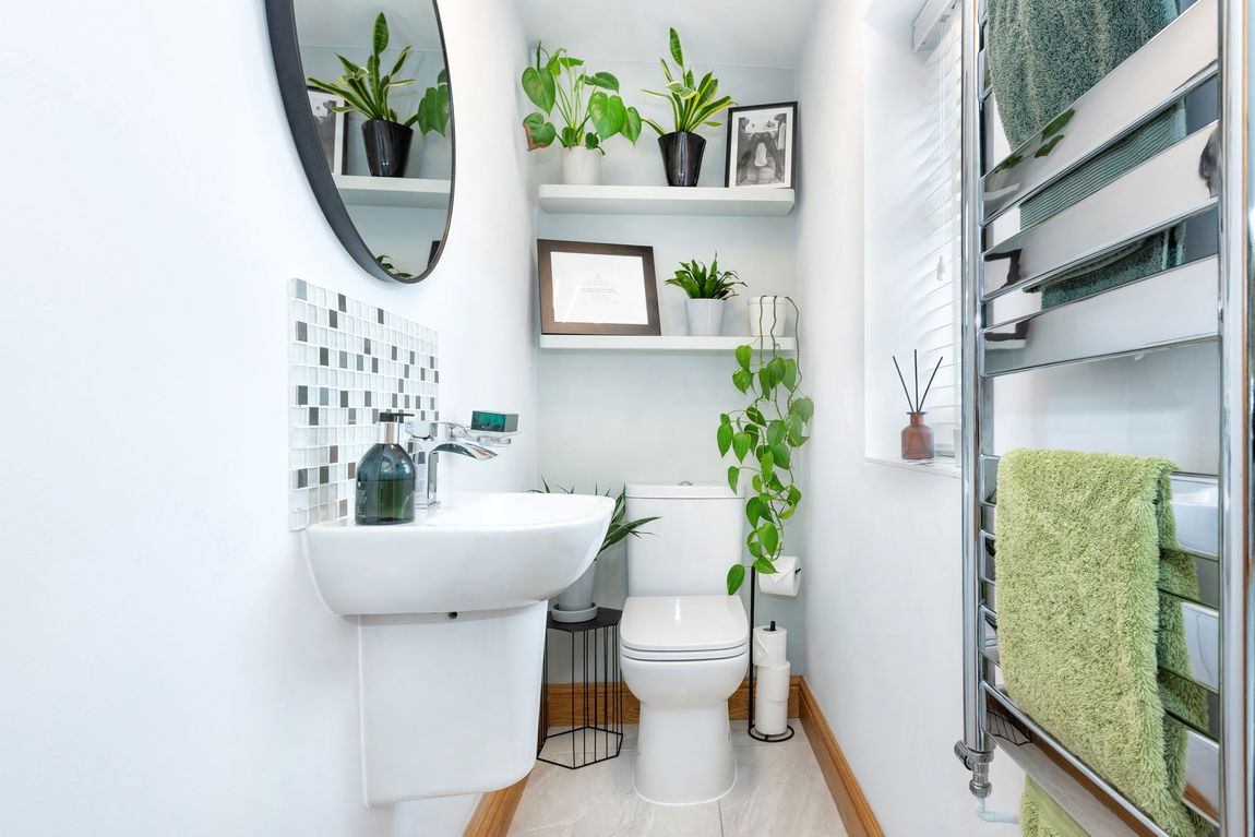 Having a low flush w.c, wash hand basin with tiled splash back, heated towel rail and a continuation of the ceramic floor with underfloor heating.