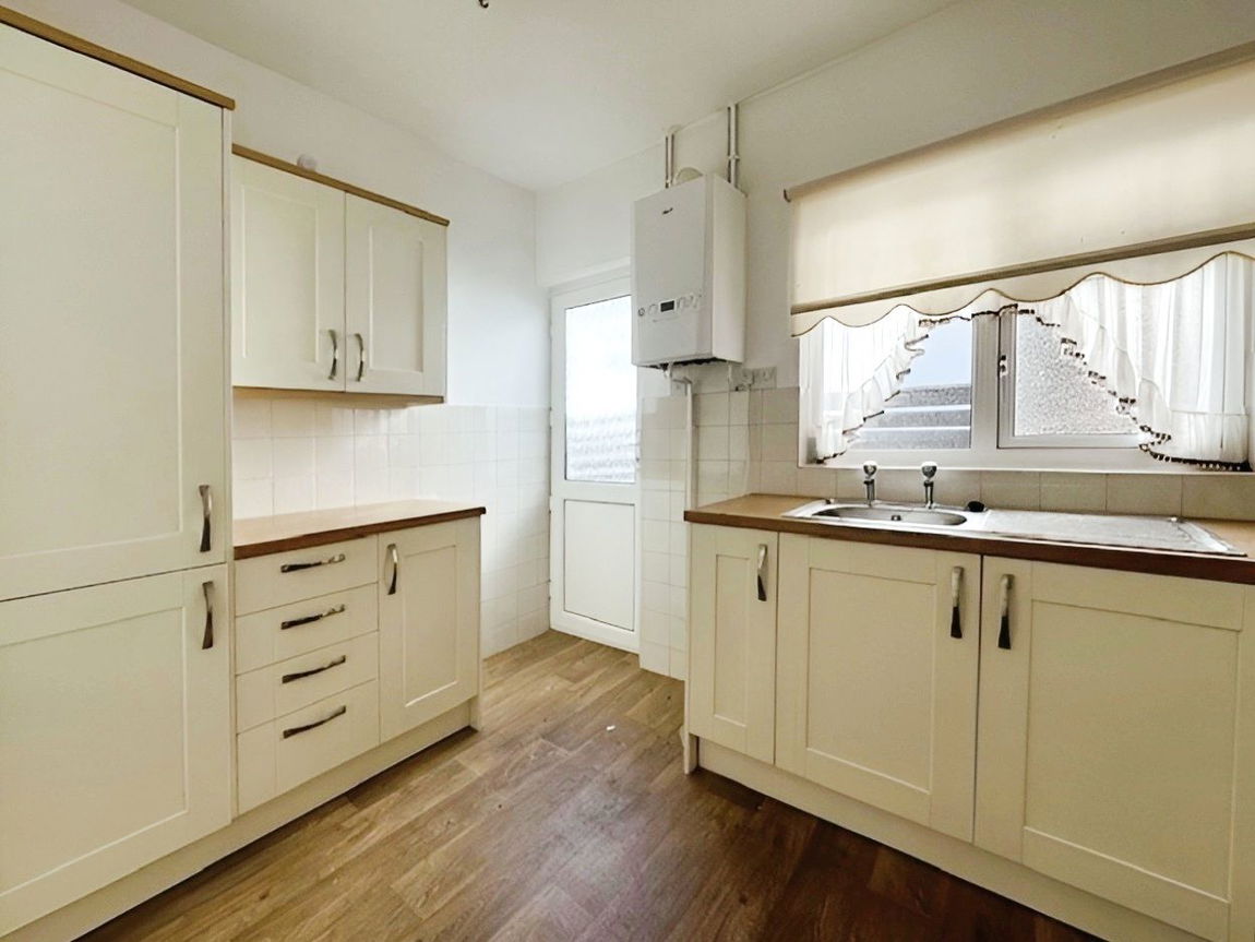 With wall mounted cupboards, worktop surface, larder cupboard, single drainer sink unit, further worktop surface with base units beneath, wall mounted boiler, power points, part tiled walls, double glazed window to side and double glazed door giving access to the side of the property.
