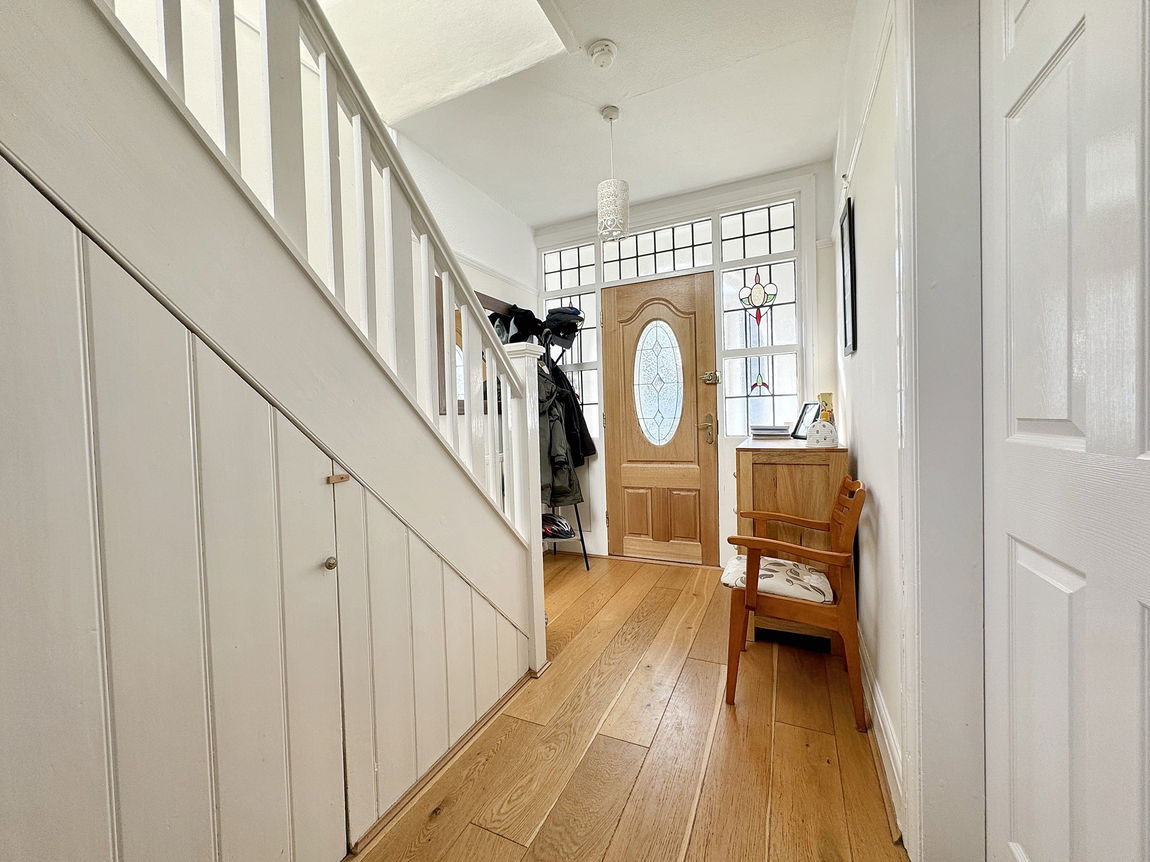 UPVC side panels and entrance door into porch. Stained glass panels and timber door open into;