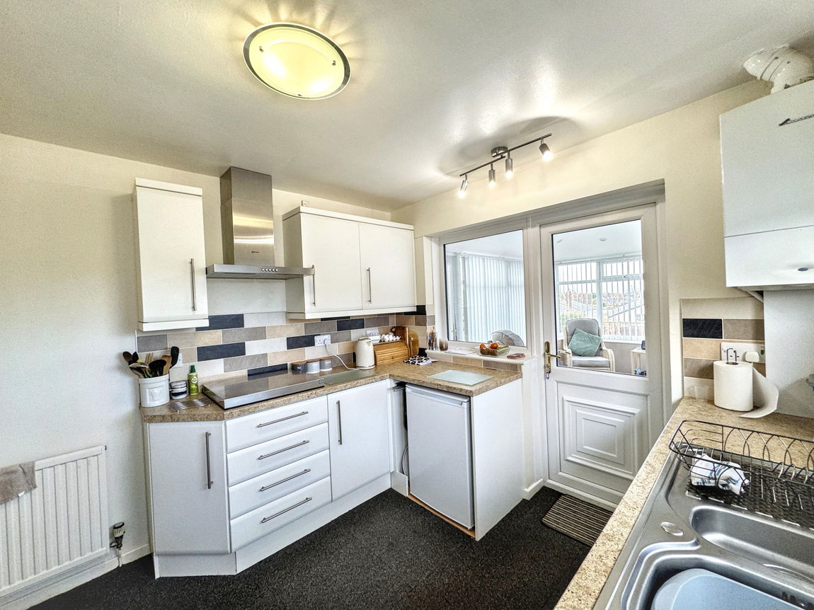 Fitted with a range of wall and base cabinets with worktop surfaces over. One and a half bowl sink and drainer with mixer tap, double oven within tower unit, four ring gas hob and extractor fan. Space for under counter fridge. Wall mounted Worcester combination gas boiler. Part tiled walls, power points, radiator, window and door to side and door to;