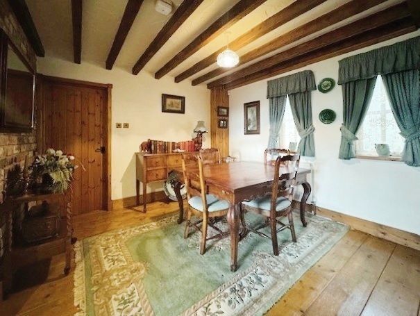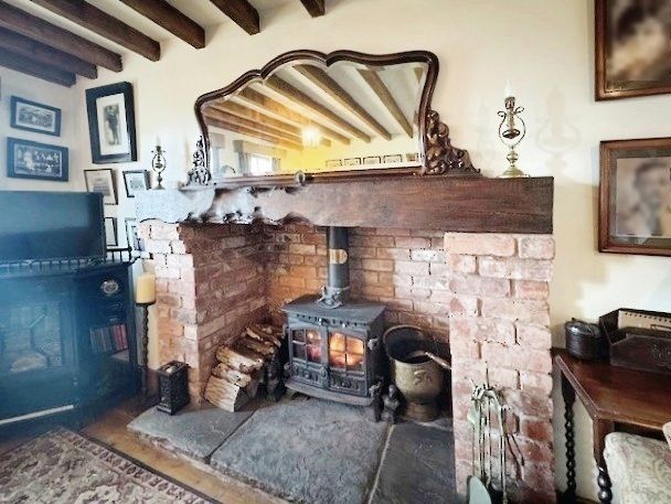 With heavily beamed ceiling, polished tongue and groove wood floor, brick feature fireplace with stone hearth and multi-fuel burner, window having an aspect over the front of the property enjoying far reaching views.