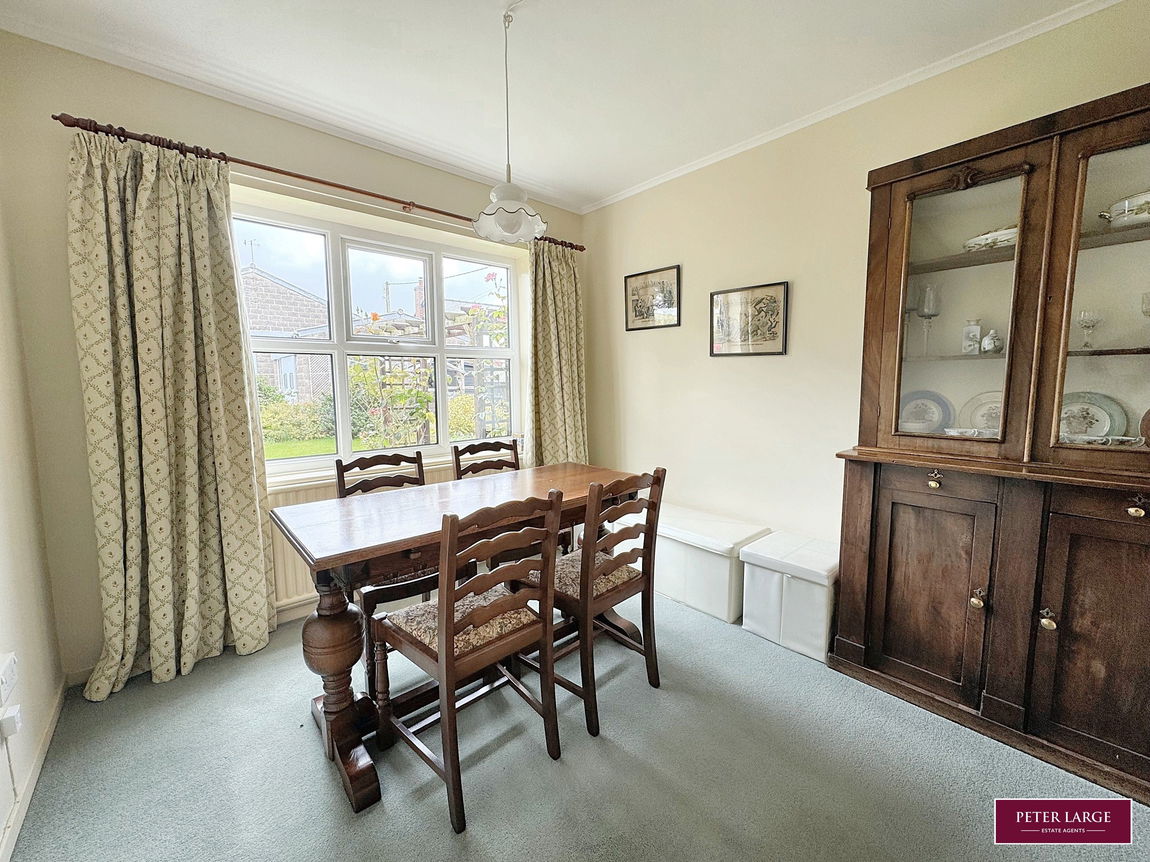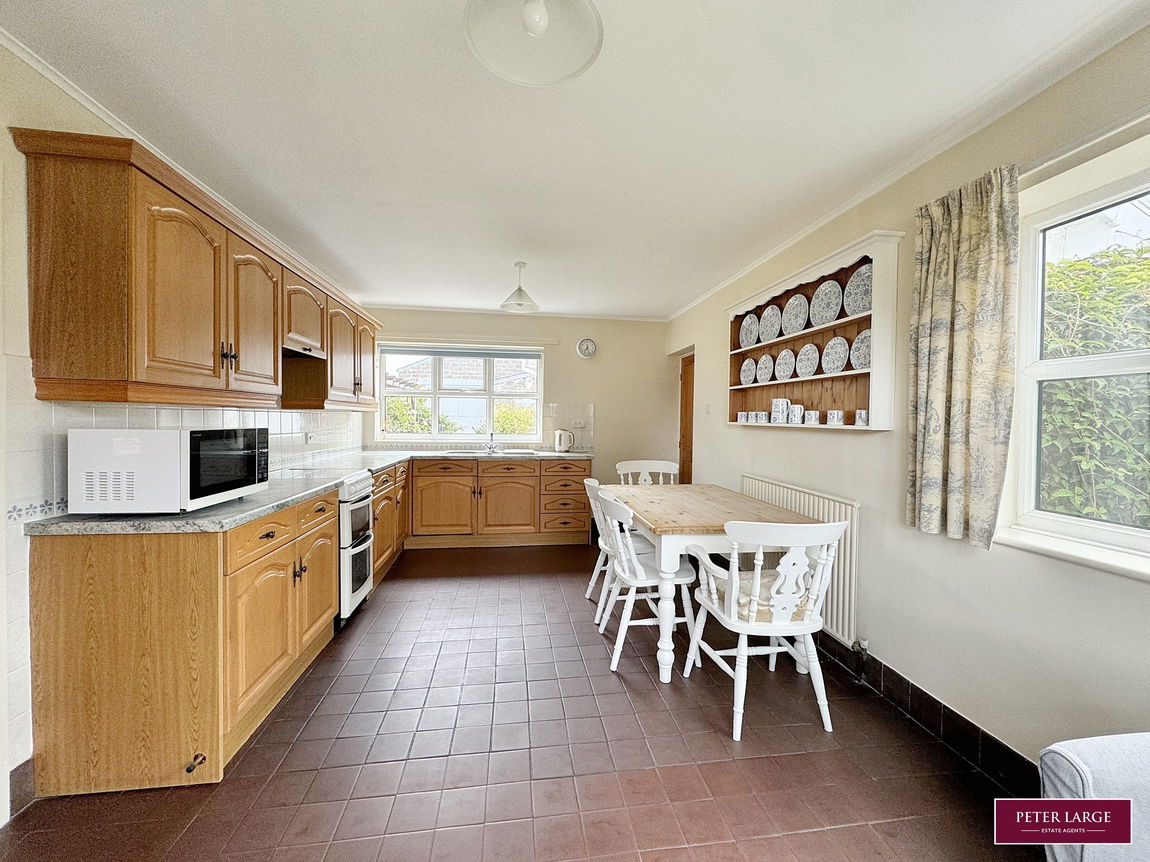 Having a range of timber fronted base cupboards and drawers with worktop surface over, matching wall units, inset one and a quarter single drainer sink unit, void for cooker with concealed convector hood over, part tiled walls, power points, double glazed window overlooking the rear garden, space for dining table and seating area, quarry tiled floor, two radiators and further double glazed widows to the front and side elevations.