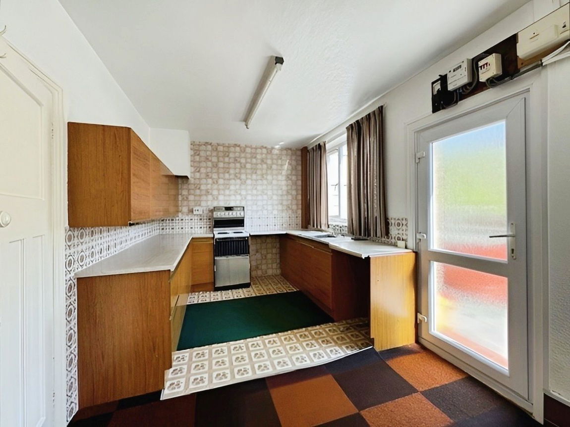 Having a range of timber fronted base cupboards and drawers with extensive worktop surface over, inset single drainer sink unit, matching wall cupboards, part tiled walls, power points, outlook and access to the rear patio, electric heater and useful understairs storage cupboard.