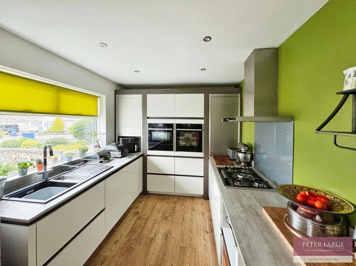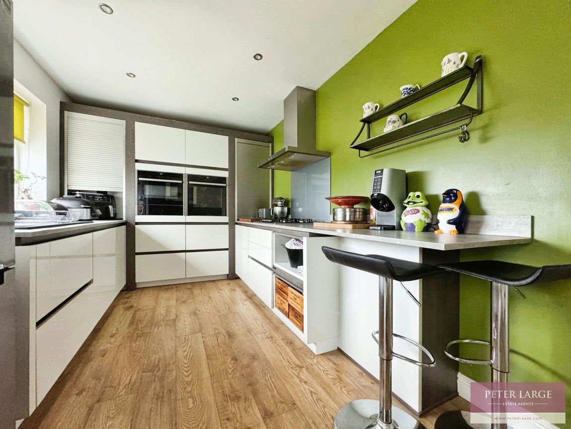 Having a comprehensive range of modern fitted unit comprising wall cupboards with roller shutters, worktop surfaces with drawer and base cupboards beneath, two eye level 'Neff' electric double ovens, one with multifunctional features and hot plate tray beneath, five ring 'Neff' gas hob with 'Neff' extractor hood over, double drainer sink with mixer tap over, integrated dishwasher, space for tall standing fridge/freezer, radiator, inset spotlighting, laminate floor, uPVC double glazed window overlooking the rear and uPVC double glazed French doors leading into: