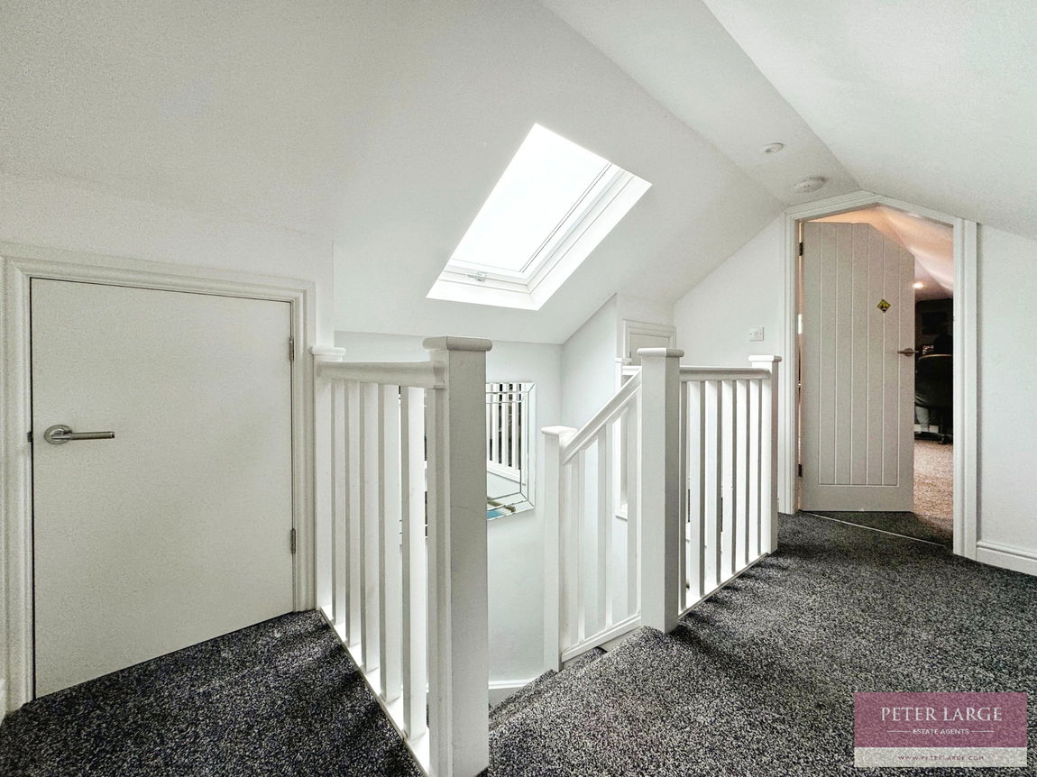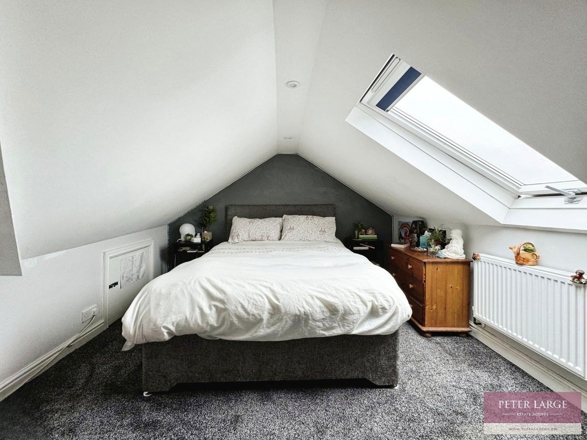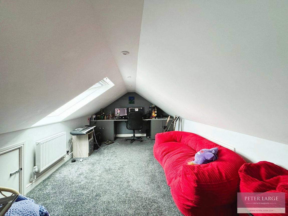 Having some restricted head height, radiator, ample eaves storage, inset spotlighting and 'Velux' roof light with views over neighbouring rooftops.