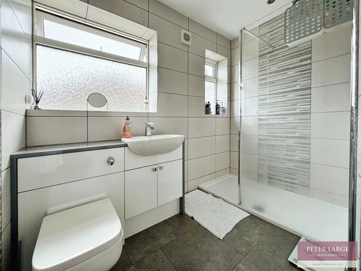 Having a large shower cubicle with mains shower over, fully tiled walls, inset spotlighting, radiator incorporating towel rail, wash hand basin in vanity unit, W.C with concealed cistern, tiled floor and dual uPVC double glazed frosted windows to the rear.