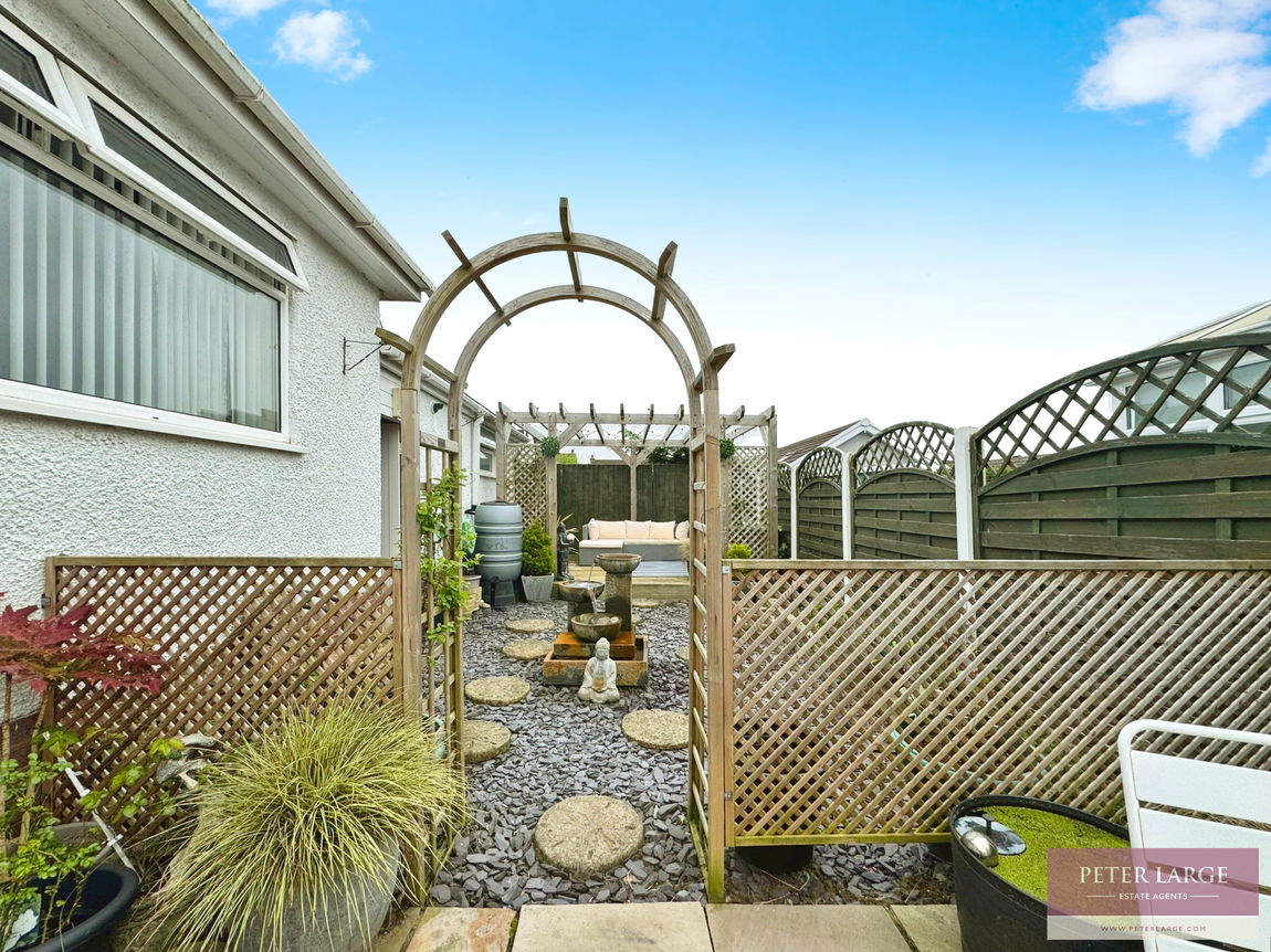Decorative brick double driveway providing ample parking leading to a double Garage 5.6m x 4.66m (18'4" x 15'3") with up and over door, power and light, utility to the rear with single drainer stainless steel sink, worktop surface, space and plumbing for automatic washing machine and dryer, work bench and wall mounted 'Ideal' combination boiler which supplies the domestic hot water and radiators.  The front and side gardens are well manicured being mainly laid to lawn with borders containing a variety of established plants and shrubs and is bounded by feature block walling. Timber door to side of garage gives access to undercover passage leading to personal door to garage and rear garden. Additionally there is a further driveway to the side, ideal for caravan/campervan or boat and timber gate gives access to the rear garden.  The lovely tranquil rear garden is landscaped for ease of maintenance with raised borders containing a variety of established plants and shrubs, patio area, ideal for alfresco dining, timber arch leading to decking with timber constructed pergola having outdoor lighting and external power points.