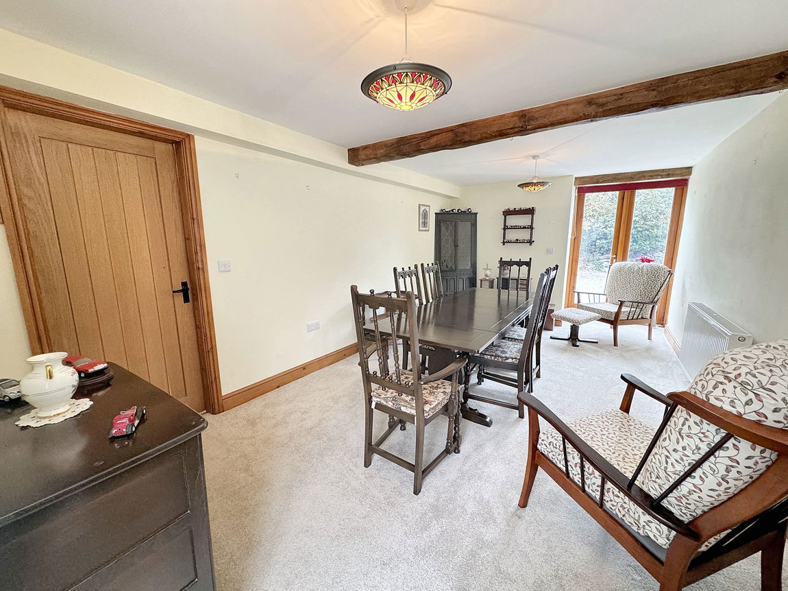 A spacious lounge with impressive brick built fireplace and mantle, slate hearth and fitted electric stove. Exposed beams, smoke alarm, three radiators and power points. Window to rear and French doors with side panels opening to the front.