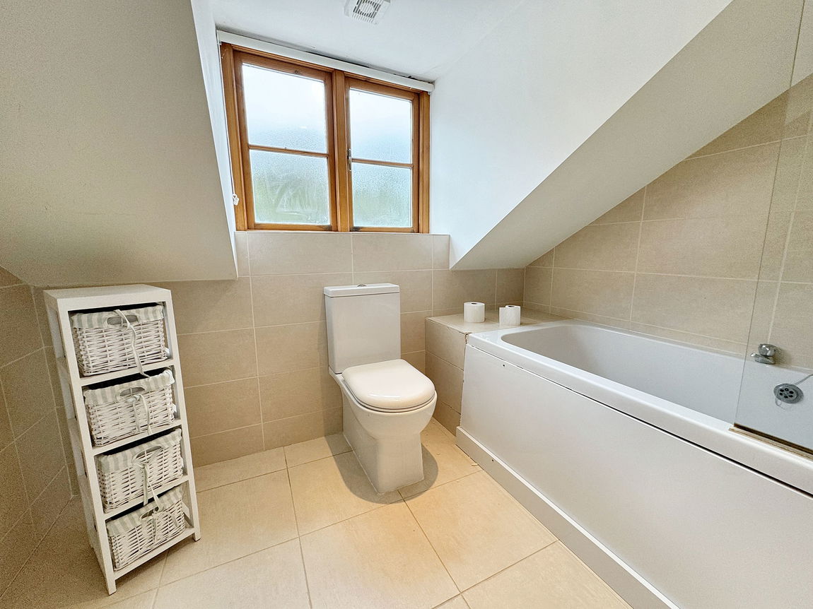 Fitted with a three piece suite comprising low flush wc, pedestal wash hand basin and panel bath with shower and screen. Fully tiled walls and floor, extractor fan, obscure glazed window and radiator.