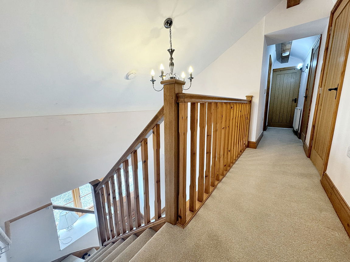 Timber staircase with handrail leads to 'minstrel gallery' landing with smoke alarm, exposed beams, wall light, power points and radiator.