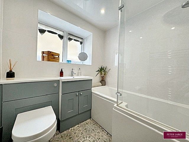 Having a three piece suite comprising wash basin, low flush WC set into a vanity unit, panelled bath with shower over and privacy screen, part tiled walls, part panelled wall to shower area and chrome heated towel rail.