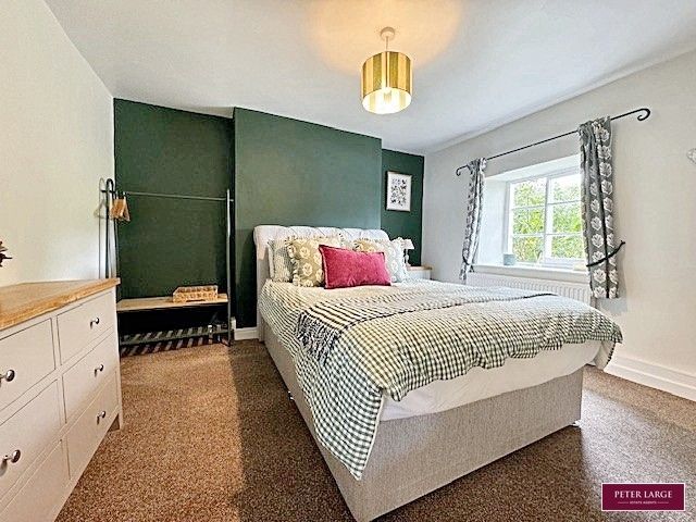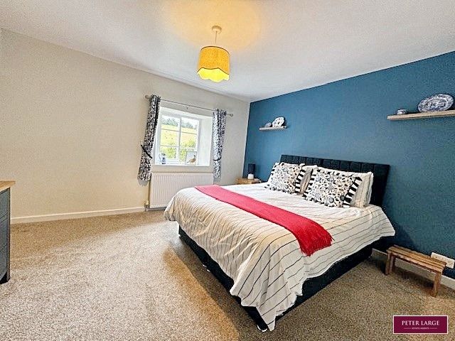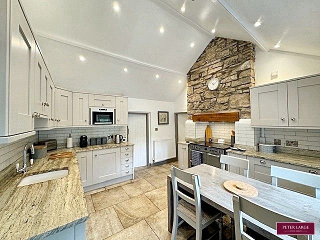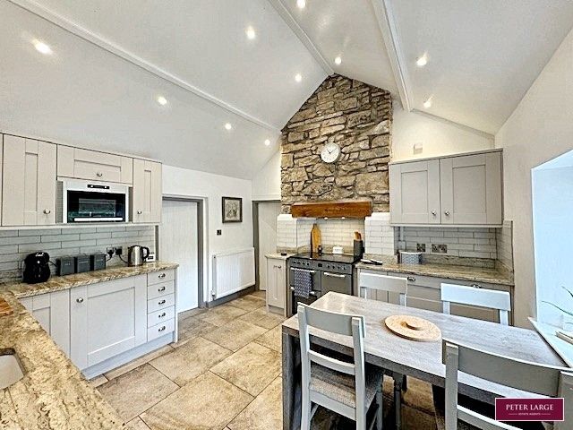 Having an extensive range of fitted units comprising wall cupboards with granite work surface, single bowl sink, a range of drawers and base units beneath, integrated dishwasher with matching front decor panel, built in microwave, void for range cooker, feature stone chimney breast, vaulted ceiling breakfast bar, double panelled radiator, part tiled walls, power points and single glazed window to the front.