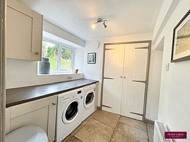 Having a wall mounted cupboard, worktop surface with base unit beneath, plumbing for automatic washing machine, power points, tiled floor, radiator and large storage cupboard with shelving.