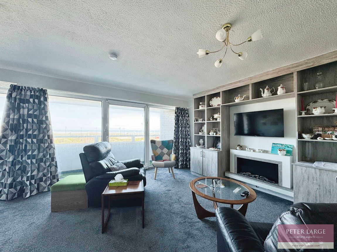 With coved ceiling, power points, built-in storage shelving to include desk area, wall mounted feature electric fire, Dimplex electric heater, uPVC double glazed sliding patio door with floor to ceiling double glazed windows to each side leading out onto the balcony with spectacular views over the coast line, open access into kitchen/diner.