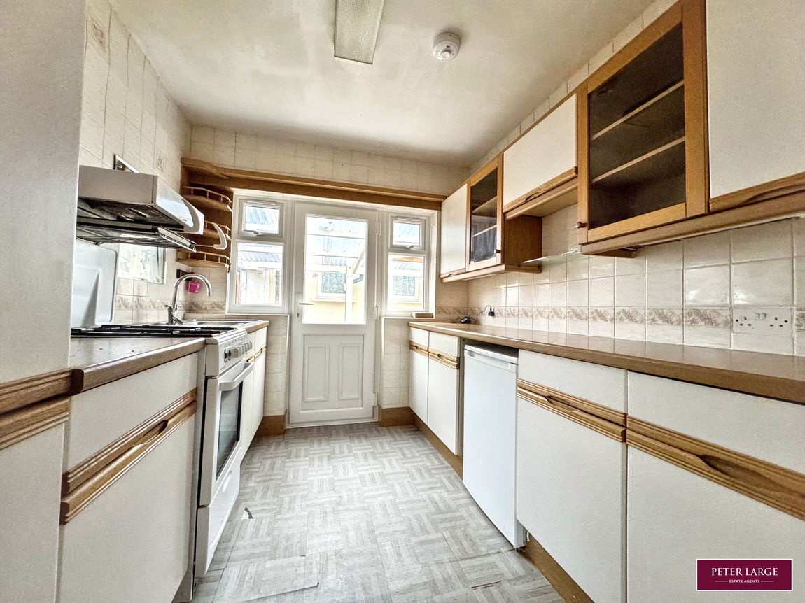 Having a range of base cupboards and drawers with worktop surface over, matching wall units with two glass fronted China display cabinets, cupboard housing the gas fired boiler, space for a under counter fridge, void for a gas cooker, single drainer sink unit, tiled walls, loft access point with a pull down ladder, uPVC double glazed door and windows to the side elevation.