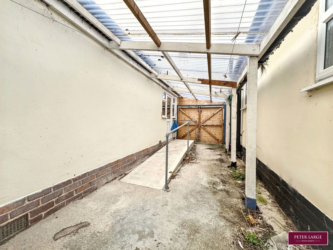 The property is approached via double gates on to a driveway providing off road parking with a pedestrian gate and pathway to the front entrance.  The front garden is laid to lawn, timber gates to the side of the property lead to a covered area with a ramp giving access to the side door into the Kitchen.  There is an OUTBUILDING with plumbing for an automatic washing machine and power point.  The rear garden has a paved patio with lawn adjoining, mainly bounded by timber fencing.