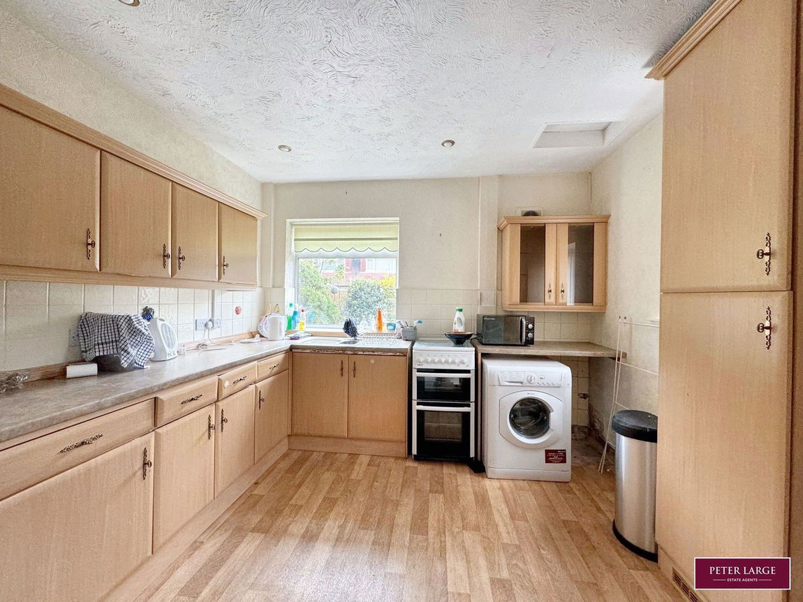 Having a range of base cupboards and drawers with worktop surface over, matching wall units, tall cupboard housing the 'Ideal' gas fired boiler serving the domestic hot water and heating system with shelving beneath, one and a quarter stainless steel sink, void for a gas cooker, plumbing installed for automatic washing machine, double glazed window to rear and side elevation, inset spotlighting, double panelled radiator, Pantry with power point and shelving, timber and glazed door to side elevation.