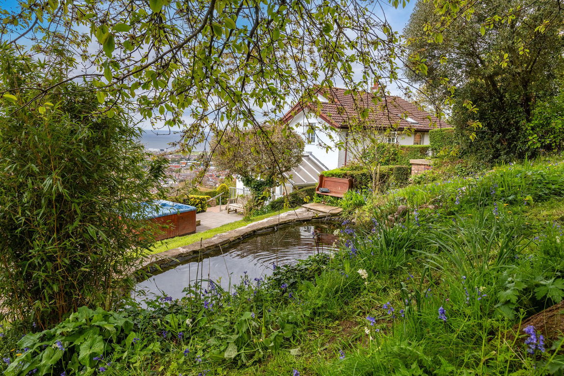The property stands in approximately 1.5 acres and is approached over a private lane to a parking area for several vehicles and a DETACHED GARAGE with a remote controlled door with OFFICE space to the first floor. A pedestrian gate with steps and pathways lead up to the front entrance with the landscaped front garden having an array of manicured shrubs and privet hedging. There is a side block paved patios take full advantage of the breathtaking panoramic views, having a ornamental fish pond and further patio with useful outside GARDEN STORES, tiered lawned gardens and a Greenhouse are encompassed by almost self-maintaining natural woodland which are matureed and form part of the edge of the Conservation area of the well-known Bishopswood and offers various trees such as Sycamore, Ash and Cherry. This area can also be accessed via a five bar gate from the parking area.