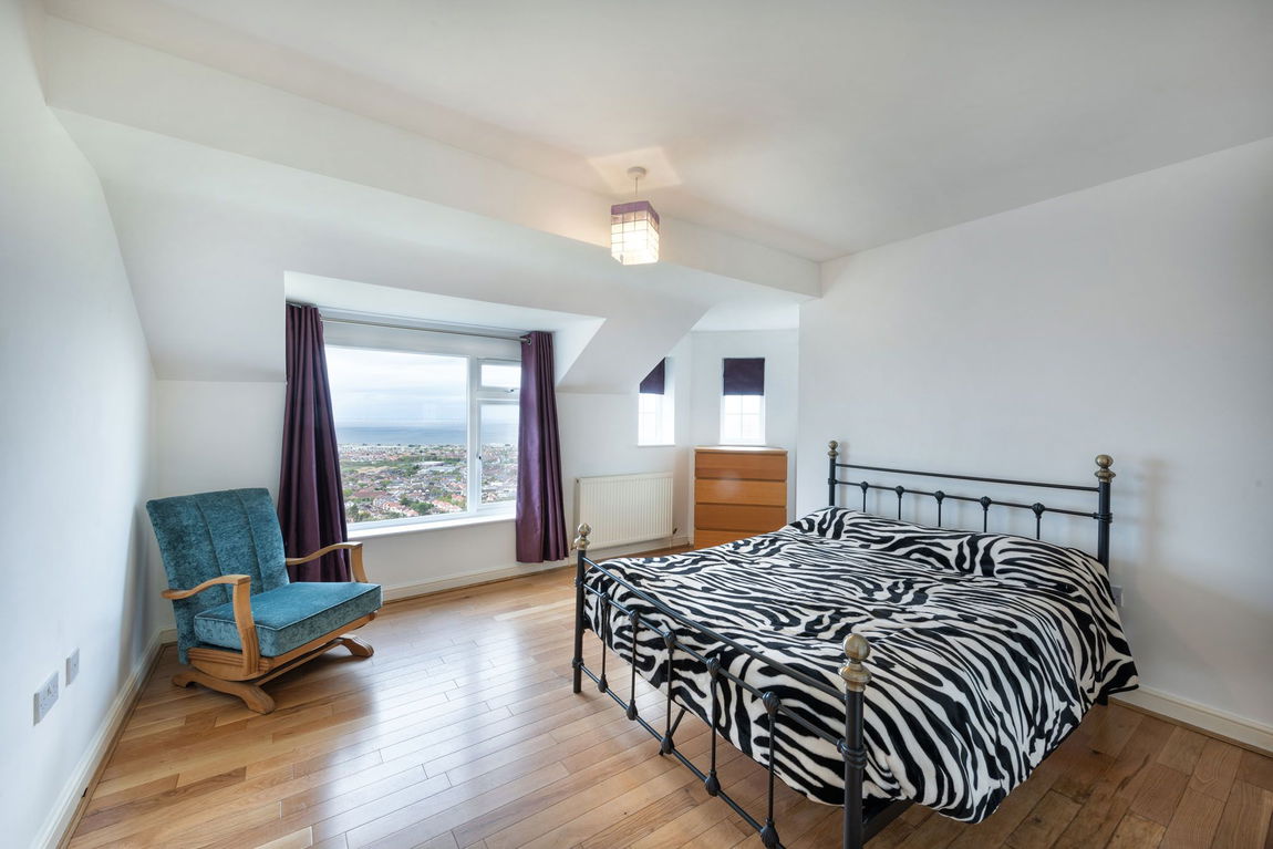 Having Oak flooring, fitted wardrobes with sliding doors, radiator, power points, large picture window with fabulous views over the town and coastline, three further double glazed windows taking full advantage of the stunning outlook.
