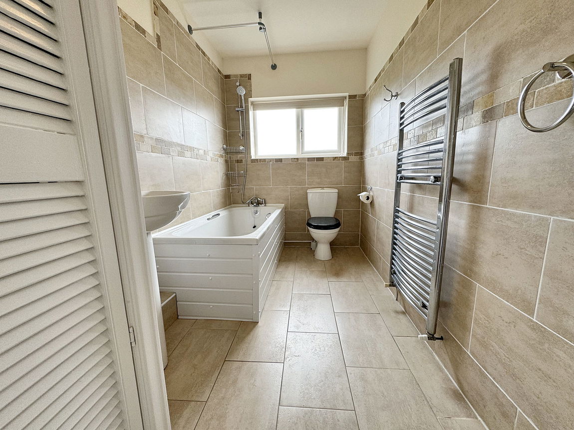 Fitted with a three piece suite comprising low flush wc, bath and wash hand basin. Part tiled walls and obscure glazed window.