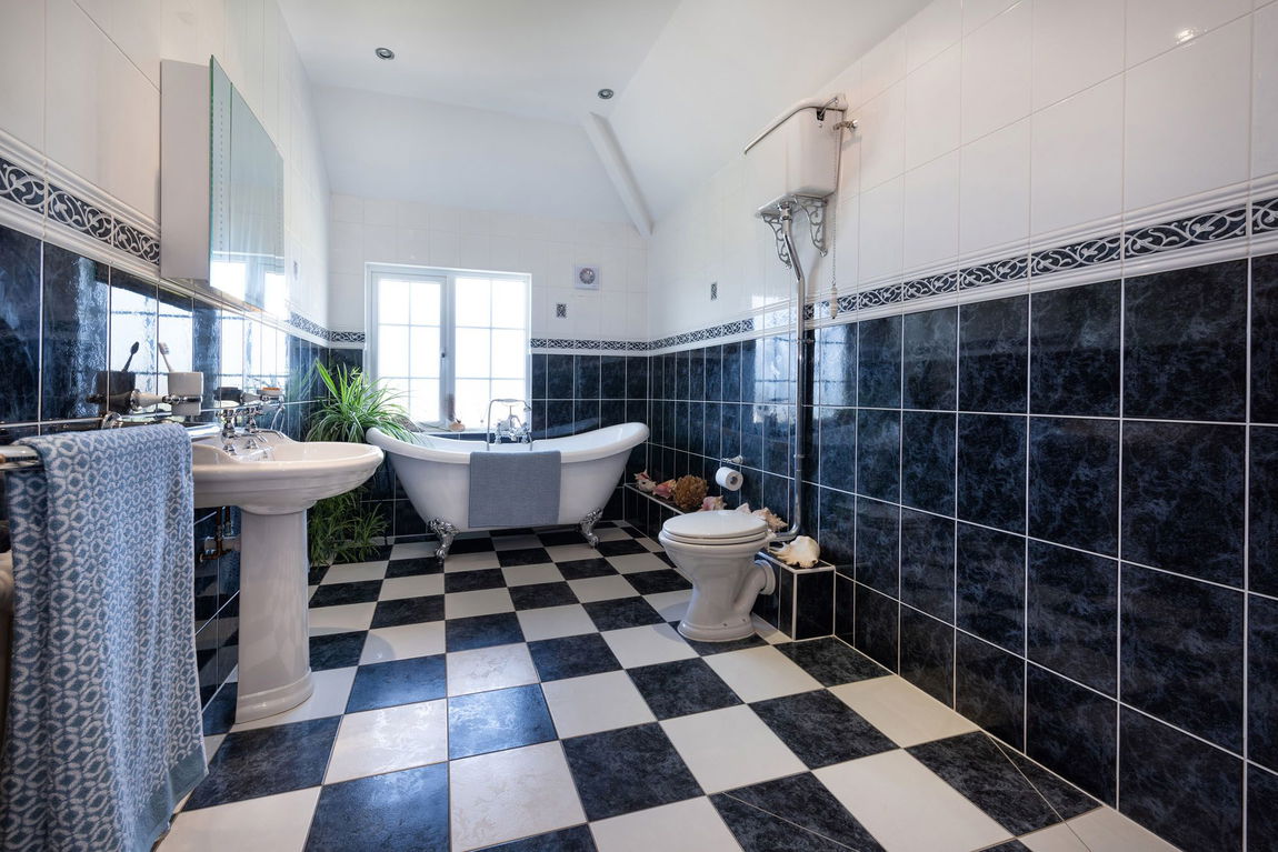 Having a four piece suite comprising free standing roll top claw foot bath, high level w.c., pedestal wash hand basin, shower area, Victorian style radiator with towel rail, fully tiled walls, complimentary floor tiles with underfloor heating, obscure glazed window and inset spotlighting.
