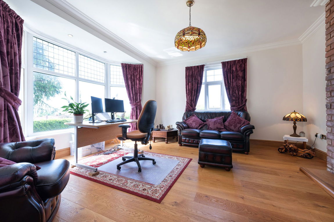 Having a continuation of the Oak flooring with inset uplighting, feature cast iron electric stove set into a brick chimney breast and Oak hearth, coved ceiling, inset spotlighting to ceiling, two double glazed bay windows to the side elevation and power points.