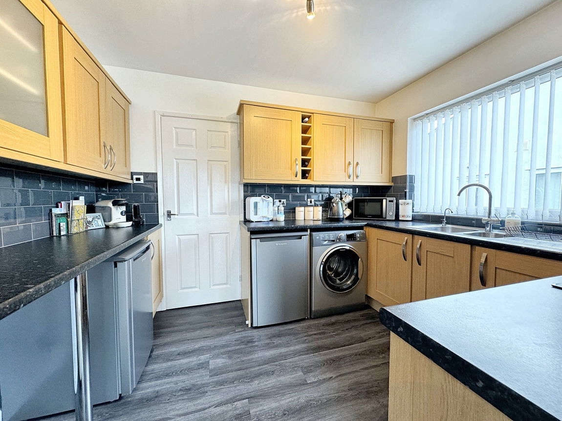 A thoughtful layout and comprising of a range of wall and base units with complementary worktop over. Space for a under counter fridge and freezer and space and plumbing for a washing machine. One and a half bowl sink with taps over, sits underneath the window which overlooks the side elevation. Oven with four ring hob and extractor hood over. Large pantry cupboard, wine rack, breakfast bar and 'Logic' boiler. Fitted with lighting, power points and radiator. Archway leads into;