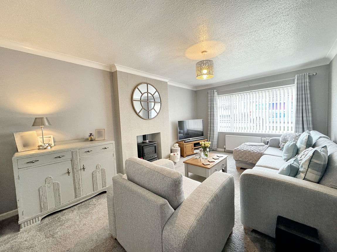 A bright room with large window overlooking the front elevation. Fitted with focal gas fire with stone hearth. With lighting, power point and radiator.