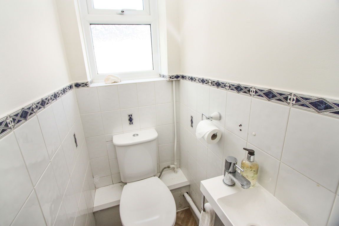 Fitted with a pedestal wash hand basin, low flush wc and panelled bath with 'Mira' shower over. Obscure glazed window, coved ceiling, fully tiled walls and chrome ladder style radiator.