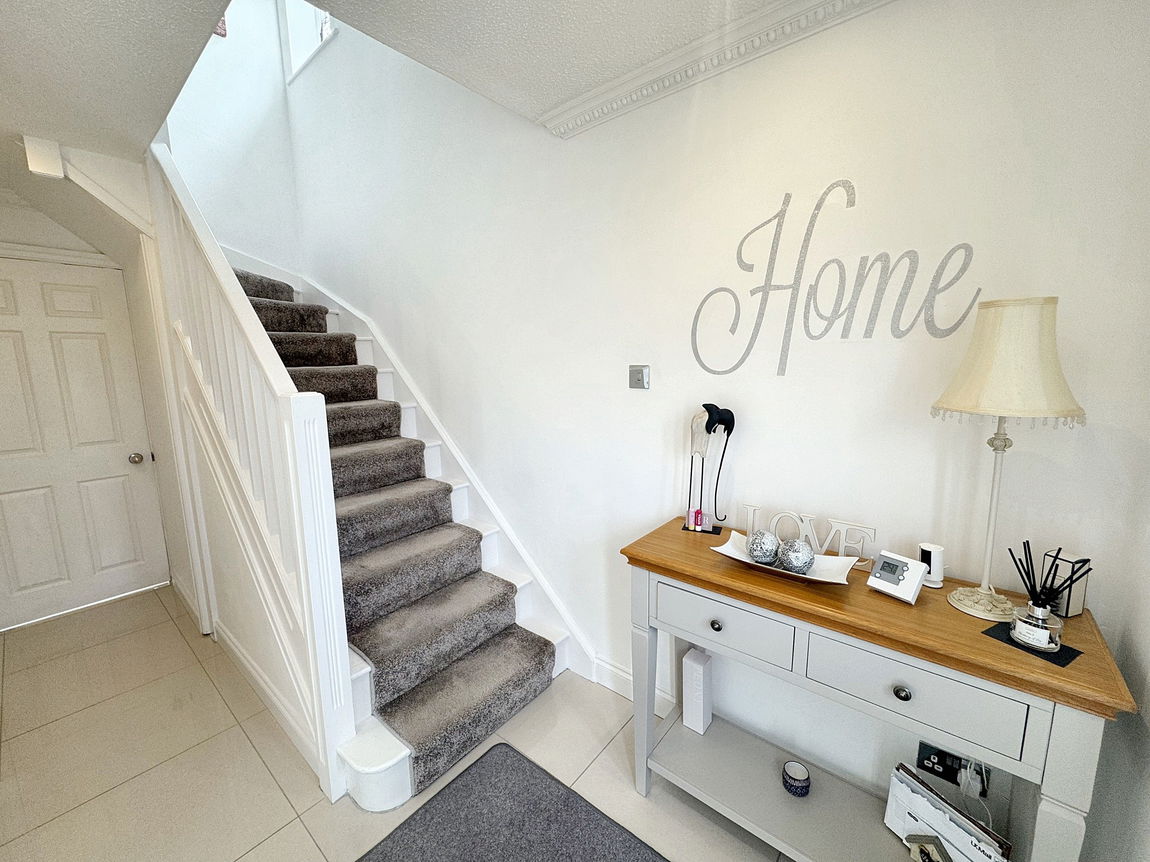 Stepping up through the front entrance door into the hallway. Tiled floor with recessed door mat and fitted with radiator, spotlights and power points. Stairs from here lead to the first floor. Door into;