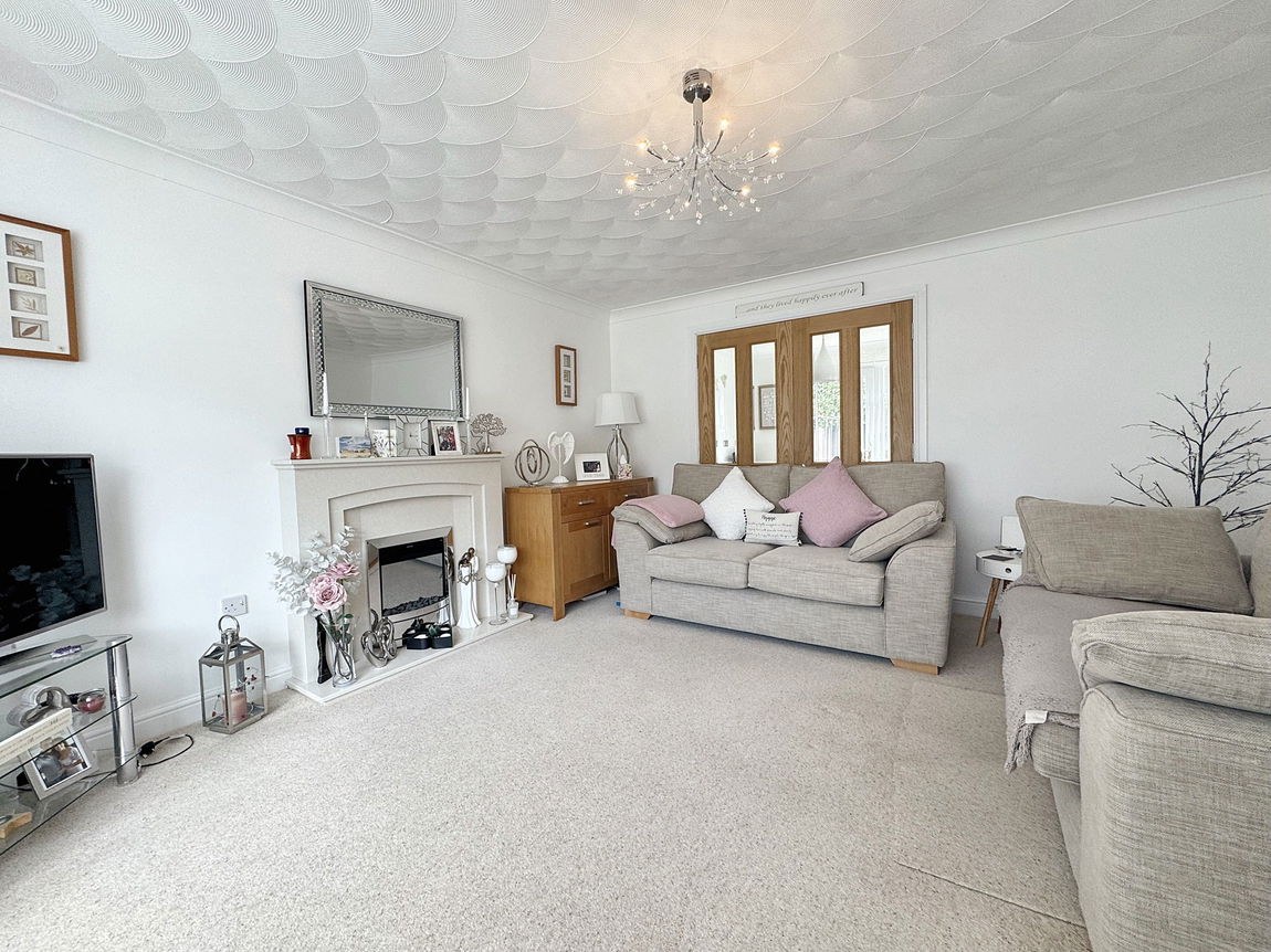 Bay window overlooking the front of the property and providing lots of natural light. Feature electric fire set with a stone effect surround and hearth. With light, power points and radiator. Double doors open into;