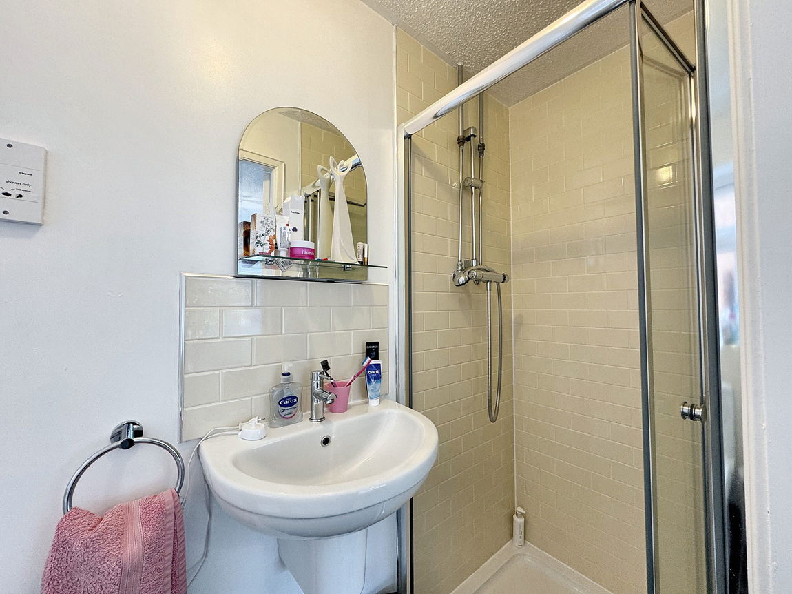 Fitted with a three piece suite in white comprising of a low flush wc, wash hand basin and walk in shower enclosure. The shower is fully tiled with a glass door. Tiled floor, part tiled walls, obscure window to the side, lighting and radiator.