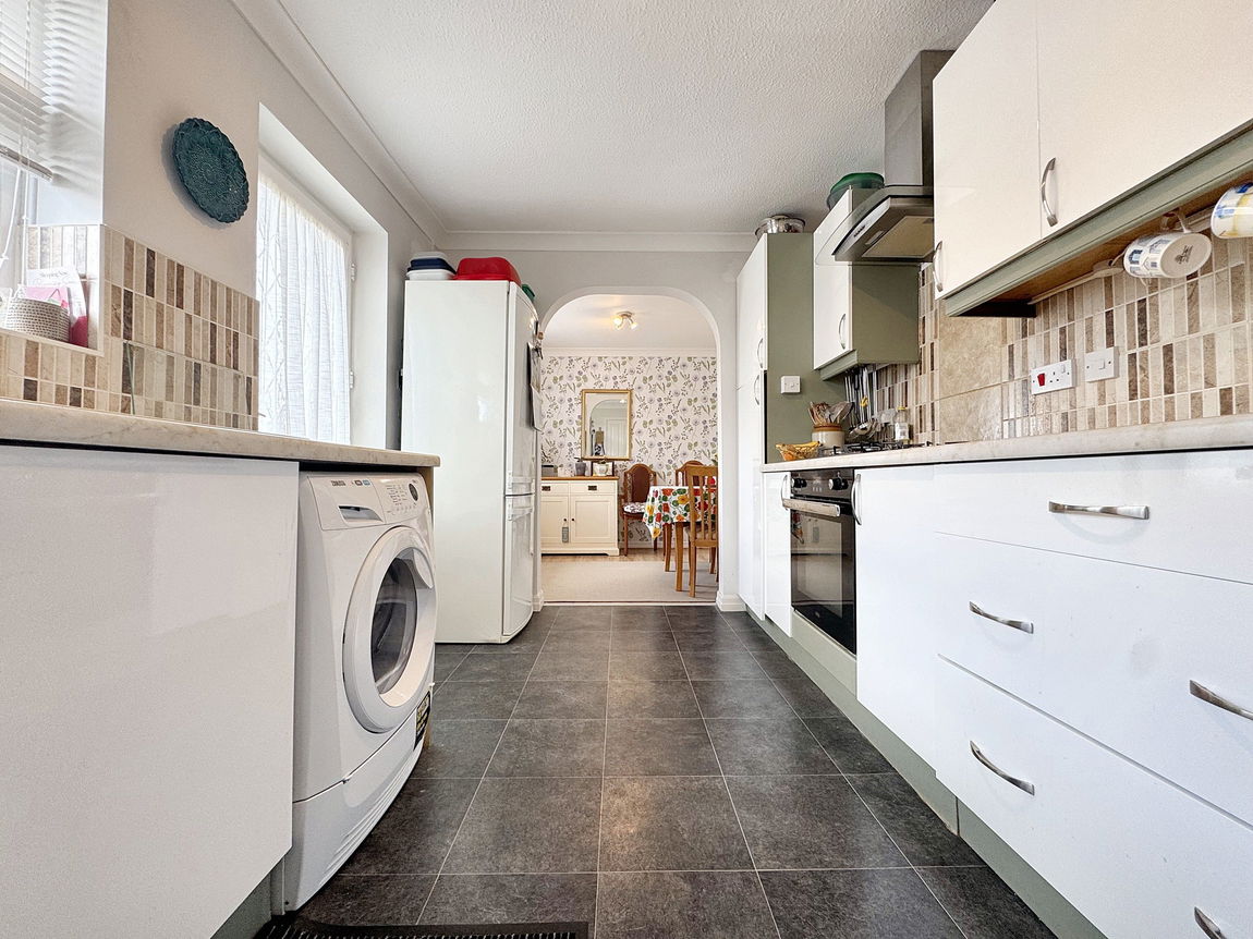 A bright and welcoming kitchen and dining room (2.53 x 2.43), separated by an arch and fitted with a range of wall and base cabinets with worktop surfaces over. Integral electric oven, four ring gas hob and extractor canopy. Spaces for appliances, one and a half bowl sink and drainer with mixer tap, Coved ceiling, two radiators, part tiled walls, vinyl flooring and power points. Windows and door to side.