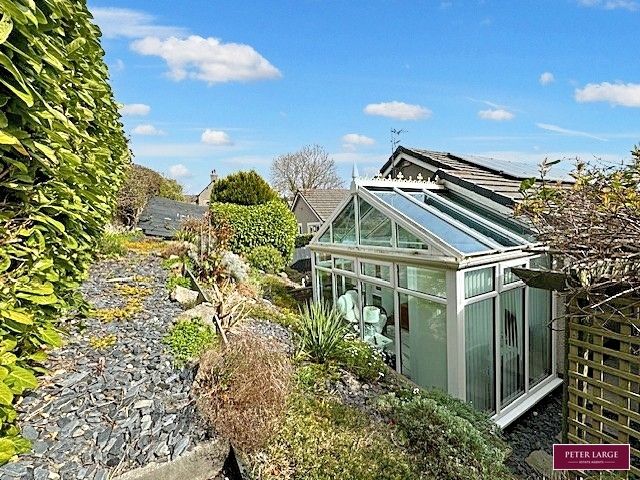 The property enjoys easy maintenance gardens being paved and gravelled to front with driveway leading to a detached garage with up and over door, gates to side give access to the enclosed rear garden.  The rear garden is a particular feature having been paved to provide patio with steps leading up to a rockery boarder which is slate gravelled chipped for ease of maintenance having a variety of low bearing plants and shrubs.  There is a timber pergola with a further paved seating area and personal door to the garage. The air source heating pump is located in the garden.