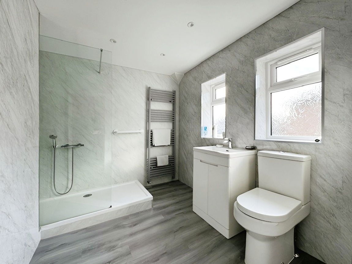 Having a three piece suite with large walk-in shower with glass splash screen, wash hand basin set into vanity unit, low flush w.c., wall mounted 'Worcester' gas fired boiler, heated towel rail, two obscure glazed windows, pvc panelled walls and inset spotlighting to ceiling.