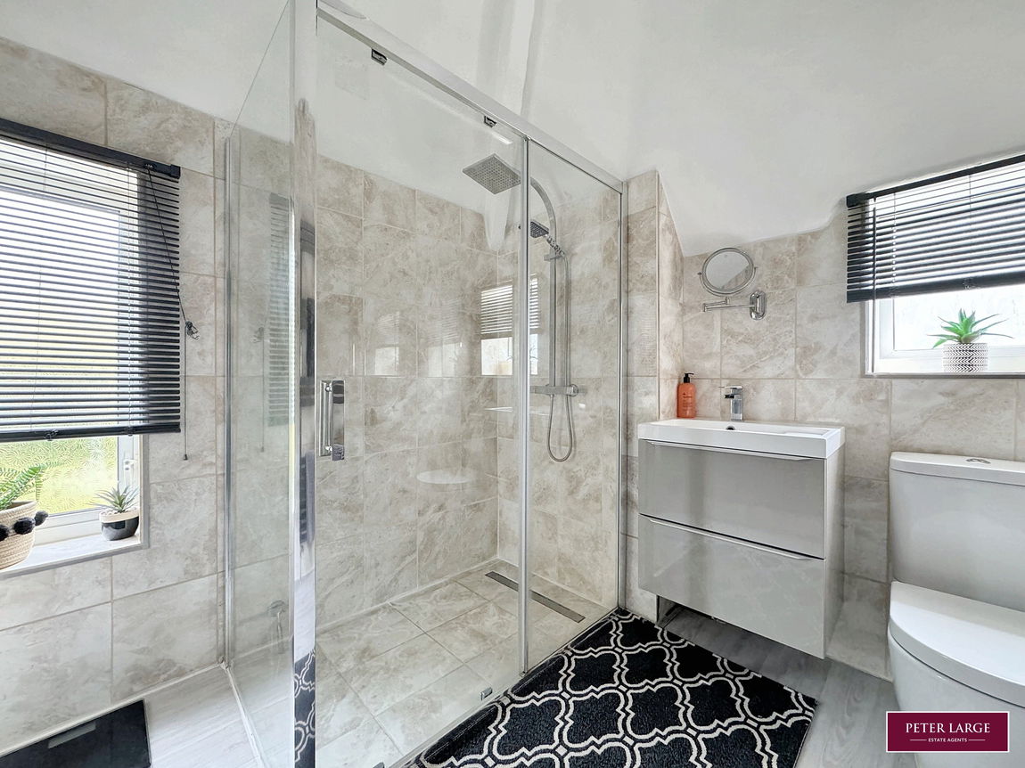 Having a three piece suite with large walk-in shower with glass screen, rainfall shower head and additional shower attachment, wash hand basin set into vanity unit, low flush w.c., chrome heated towel rail, fully tiled walls, range of fitted storage cupboards with a wall mounted mirror fronted medicine cabinet, two obscure glazed windows.