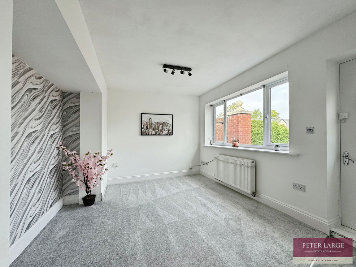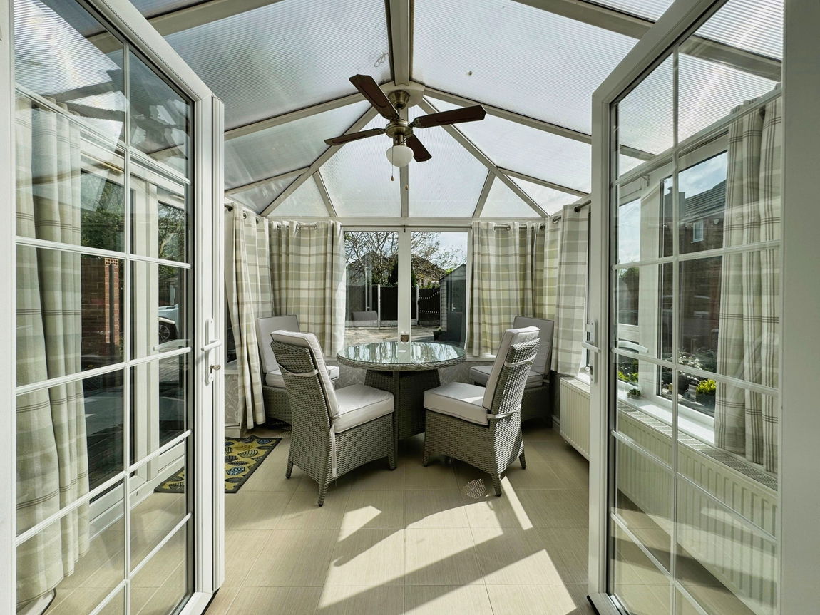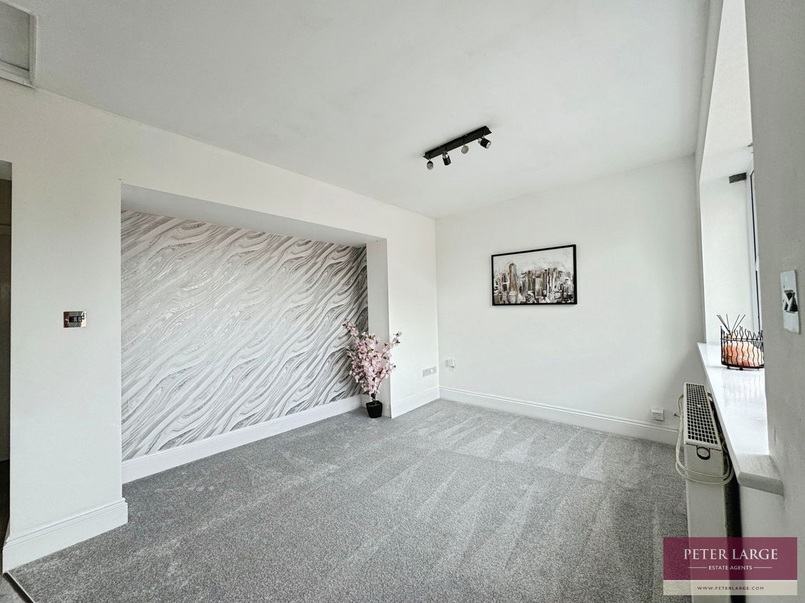 With power points, T.V aerial point, radiator, laminate floor, feature fireplace, ceiling fan, dado rail, coved ceiling, triple aspect uPVC double glazed windows overlooking both sides and uPVC double glazed French doors leading into: