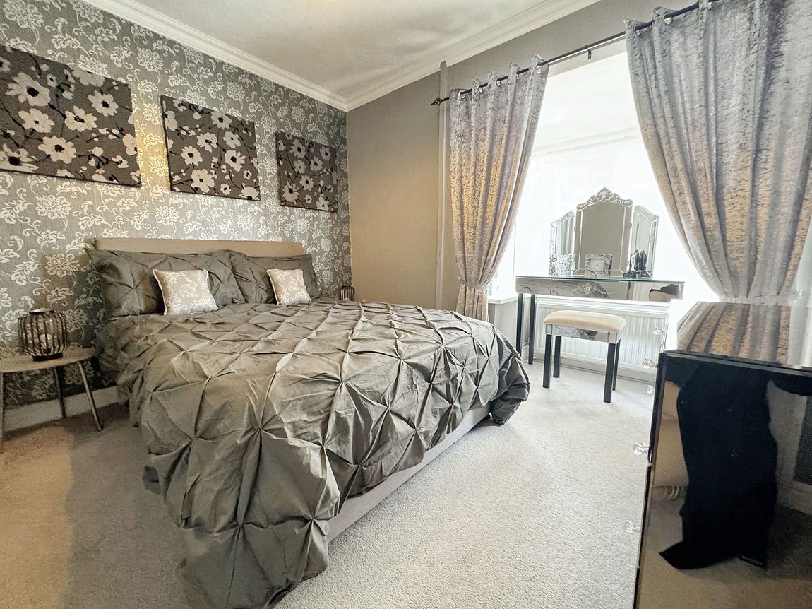 The second double bedroom with coved ceiling, box bay window to side, radiator and power points.