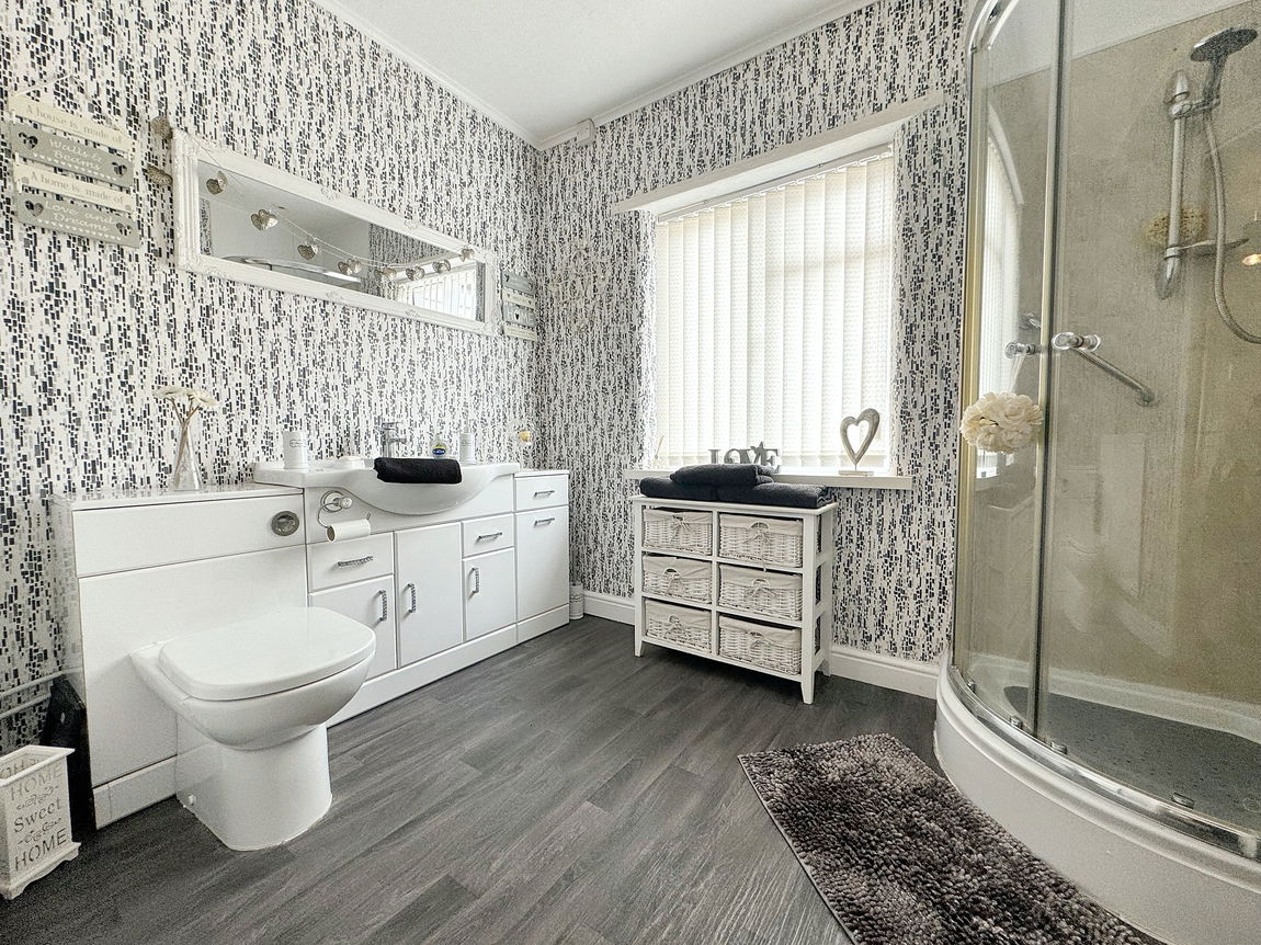 Fitted with a three piece suite comprising low flush wc and wash hand basin within cabinets, plus a shower cubicle with Triton electric shower. Window, radiator and vinyl flooring.