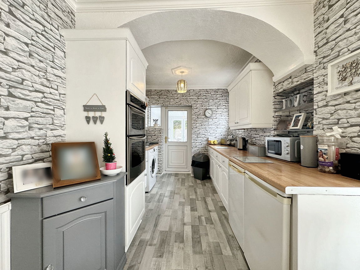 A lovely bright kitchen fitted with a range of wall and base cabinets with wood block worktop  surfaces over. Double oven within tower unit, gas hob, extractor fan, sink and drainer with mixer tap, space for washing machine and spaces for under counter fridge and freezer. Coved ceiling with spotlights, fitted cupboard housing Worcester combination gas boiler, box bay window to side, radiator, small side window and power points. Door to;