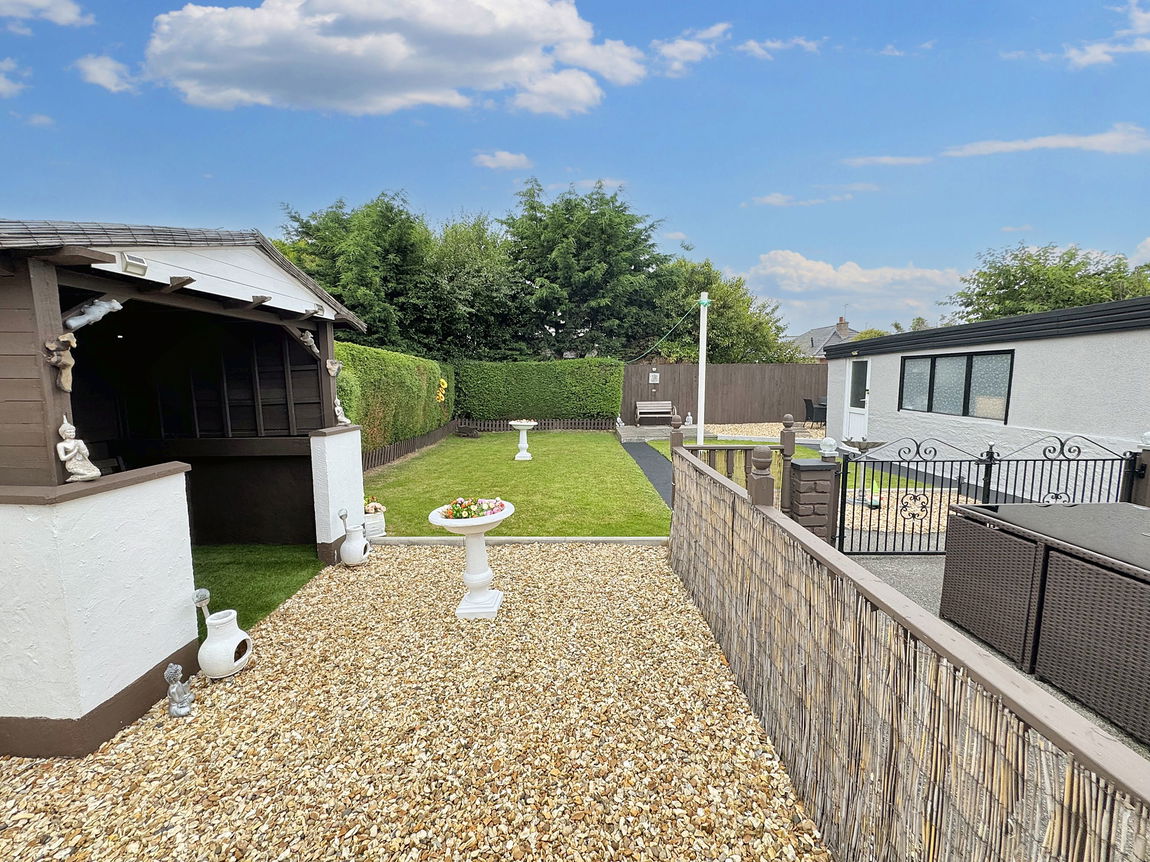 Wrought iron gates open to front area which has parking, paved pathways and gravel borders. Double timber gates open to a large side yard which allows for further parking, ideal for a motorhome, boat or caravan. The lengthy garage/workshop has an electric roller shutter door, two windows and door to side. It also has a mechanics pit. The rear garden is fully enclosed within hedging and fencing, being mainly laid to lawn with a centre path and gravel borders. A pretty summer house sits to the side and wrought iron gates and a timber balustrade divide the patio from the rest of the garden.
